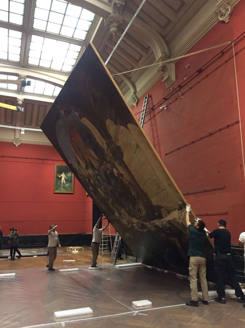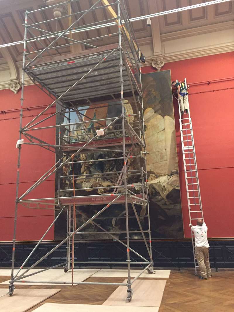Une fois au sol, les peintures ont été déplacées en lieu sûr, dans le salon blanc. La prochaine tranche verra les œuvres du salon rouge raccrochées, et celles du salon blanc déposées et entreposées … dans le salon rouge ! Une sorte de jeu de chaises musicales.